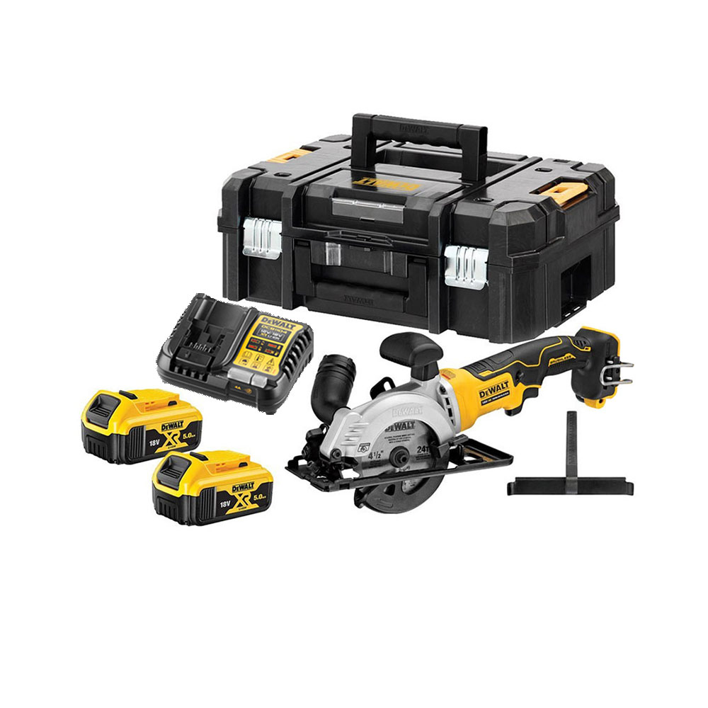 Die Dewalt DCS571P2 18V XR Brushless / bürstenlose 115 mm Kompakt- Kreissäge, nur Körper verfügt über einen DeWalt Brushless/ bürstenloser Motor für längere Laufzeit, Zuverlässigkeit und Haltbarkeit. Leistungsstarker 750-W-Motor mit einer maximalen Leerlaufdrehzahl von 0 bis 45000 U/min (rpm). Die dünne Schnittfuge mit 115 mm Durchmesser und 24-Zahn-Karbid-/Hartmetallspitze ermöglicht eine effiziente Laufzeit und eine schnelle, glatte Schnittoberfläche bei einer maximalen Schnitttiefe von 38 mm bei 90 °. Extrem langlebiges Werkzeugdesign, einschließlich eines Gussgetriebes für sich wiederholende, präzise Schnitte, eines intelligenten Auslösers, der die vollständige Kontrolle über alle Anwendungen ermöglicht, eines Sperrschalters und einer elektronischen Motorbremse für zusätzliche Kontrolle und Arbeitssicherheit, einer Spindelsperre für einen schnellen und einfachen Blattwechsel.