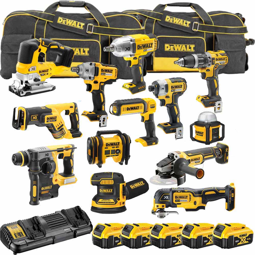 DeWalt DSET8 18V 13 Maschinen Elektrowerkzeug Set DCS355N + DCS367N + DCG405N + DCD796 + DCF887N + DCH273N + DCL050 + DCC018N + DCW210N + DCF894N + DCS334N + DCL074 + DCF899N mit 5x 5Ah Akkus, Doppeltes Ladegerät und 2 Taschen