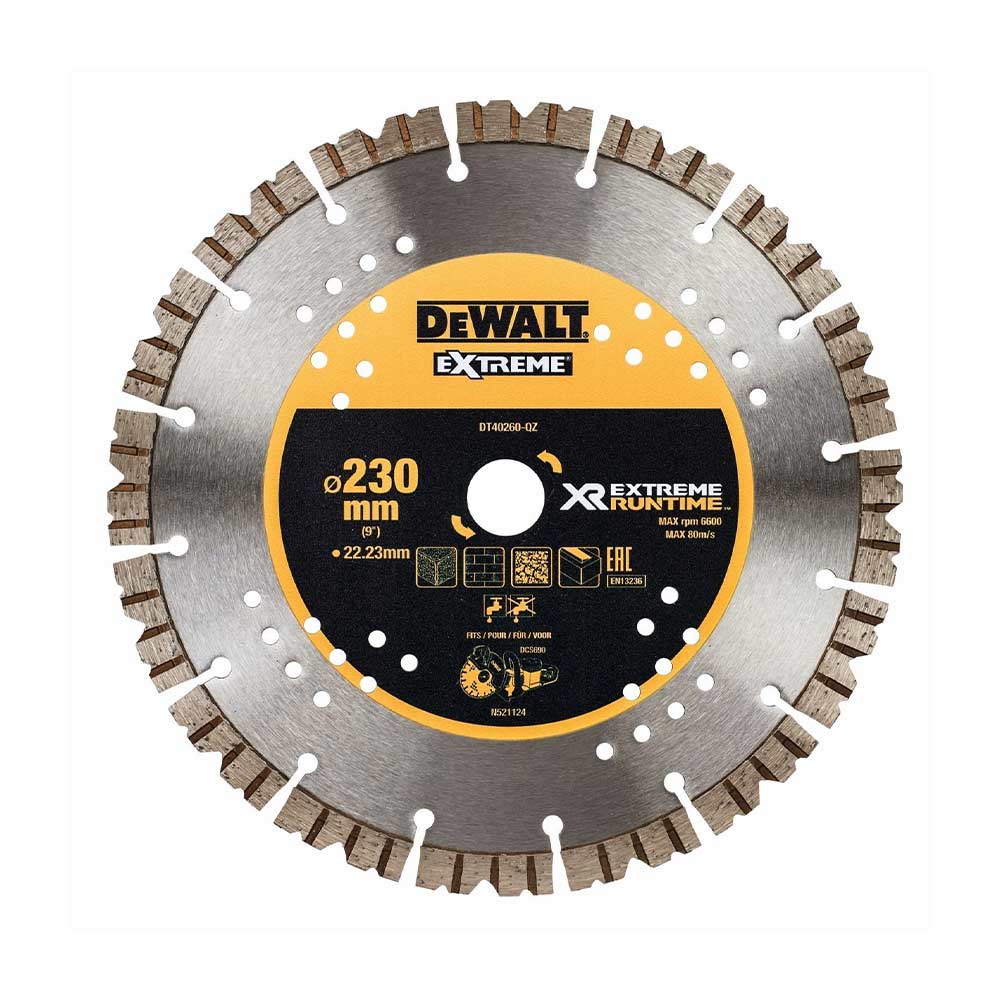 XR EXTREME RUNTIME Diamanttrennscheibe 230×22.2 mm|bis zu 2X laengere Laufzeit pro Akkuladung|Keine Kompromisse bei der Performance|Anwendung: Beton (auch armiert), Ziegel, Estrich und weichen bis mittelharten Natur- und Kunststeinmaterialien|Optimale Abstimmung auf die XR FLEXVOLT DCS690 und somit effiziente Ausnutzung der maximalen Akku-Leistung