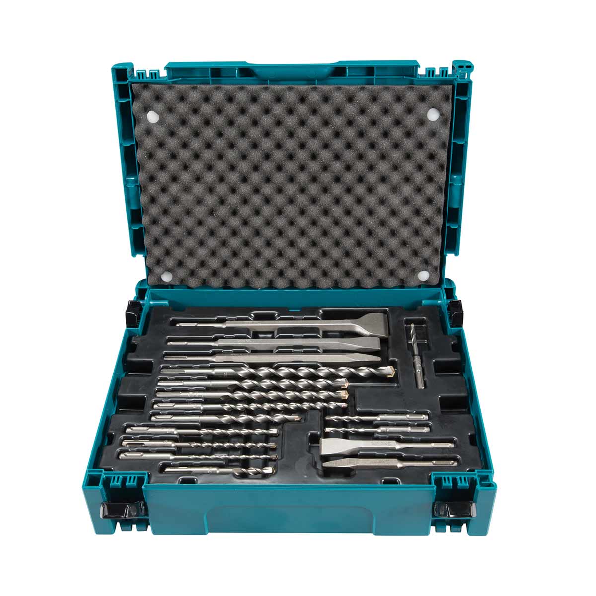 SDS-PLUS Bohrer und Meißel Set für die Arbeit mit Beton. Die Gesamtlänge der Bohrer beträgt 110-260 mm mit einem Durchmesser von 5-14 mm. Die Länge der Bohrspitzen und Meißel beträgt 140-250 mm. Der Flachmeißel ist 20 mm und der Breitmeißel ist 40 mm breit. Im Lieferumfang enthalten sind 12 Bohrern, 2 Vollmeißeln, 2 Spitzmeißel, 2 Flachmeißel und 1 Breitmeißel mit einem MAKPAC-Koffer.