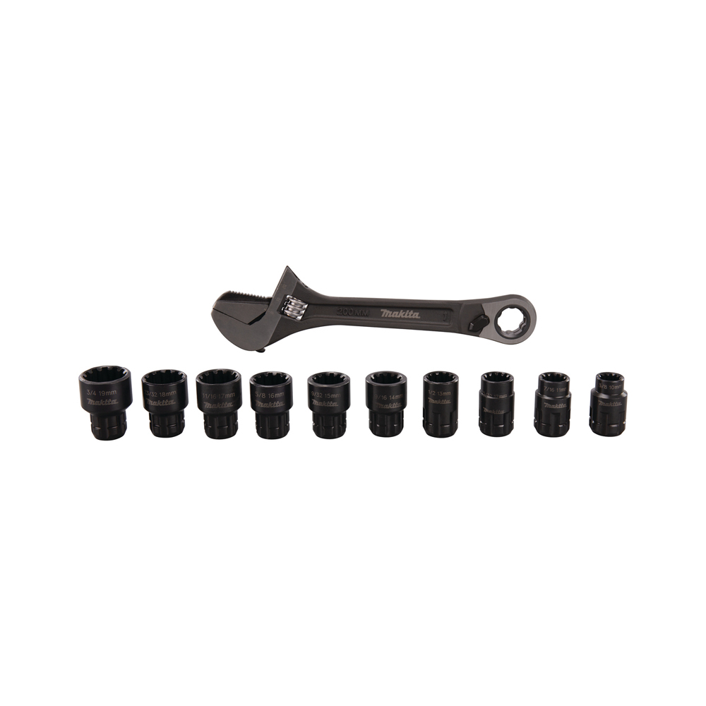 Makita Rollgabelschlüssel 200 mm mit Durchsteckknarrenfunktion und Nüssen