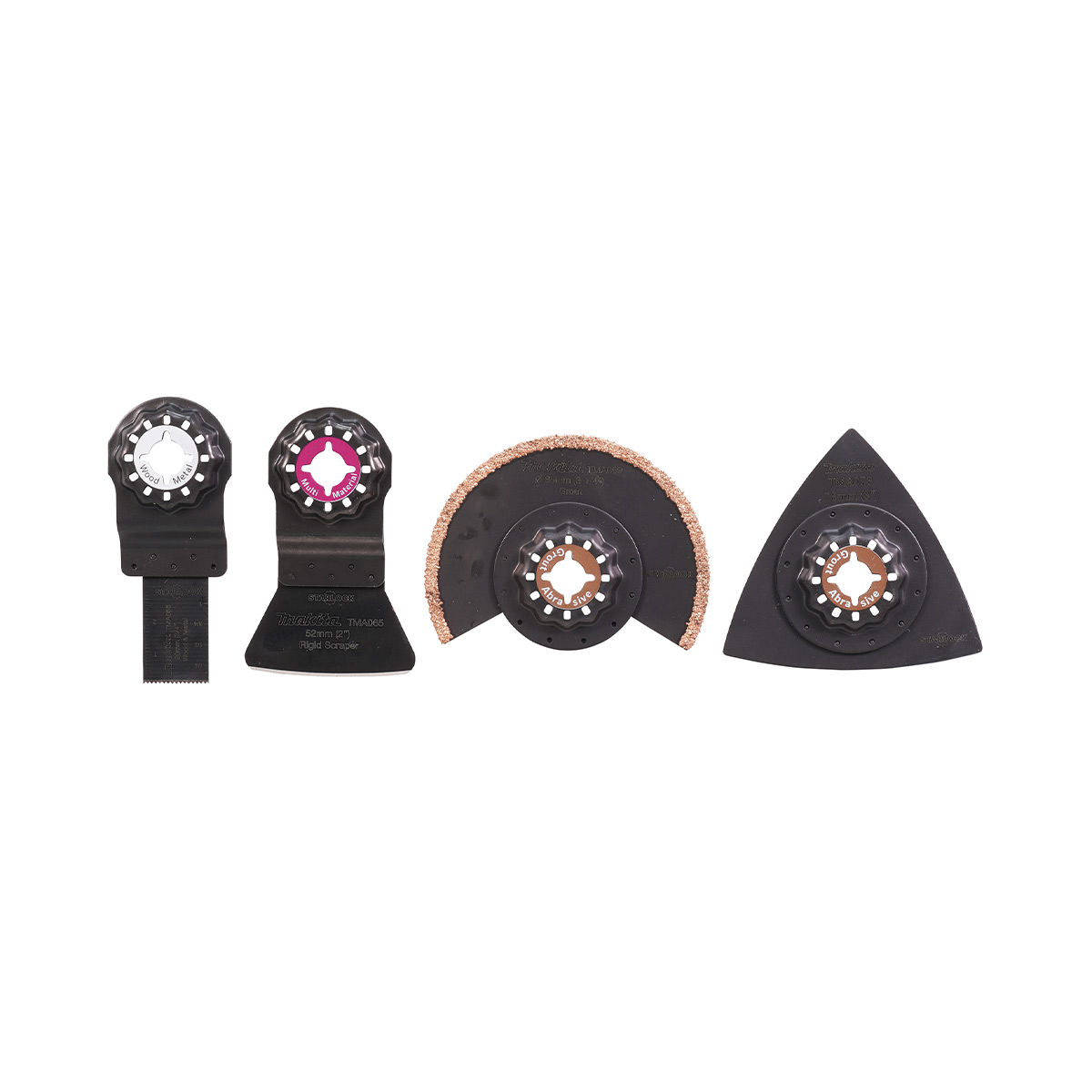 STARLOCK Multitool-Set für Fliesenarbeiten. Das Set enthält separate Sägeblätter zum Sägen von Aluminium, Holz, Fliesen, Kalkstein, Epoxy und Gipskarton. Das Set enthält auch eine TC/HM-SchleifStück. Die Schneidengrößen variieren von 20 mm bis 85 mm. Das Paket enthält 4 Blätter. B-64923, B-64989, B-65028 und B-65062.