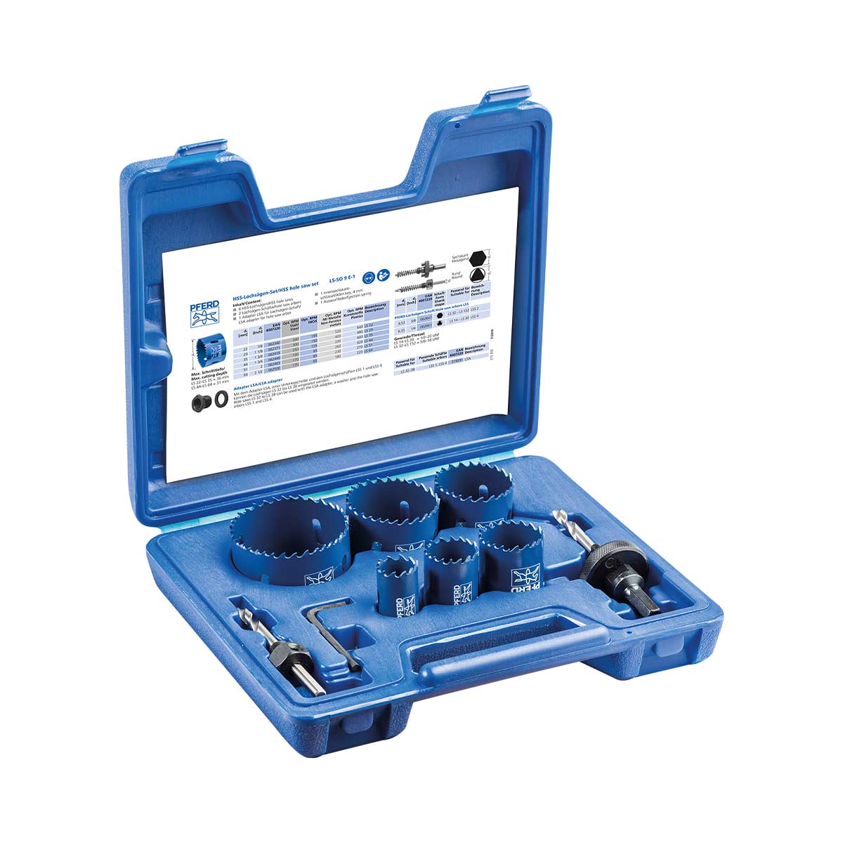 Das Set enthält sechs HSS-Lochsägen in den international gebräuchlichsten Durchmessern inklusive Zubehör für Elektriker. Es wird in einer übersichtlichen Kunststoffbox, die vor Schmutz und Beschädigung schützt, geliefert. Eine Bedienungsanleitung ist beigefügt. Der Einsatz von Lochsäge LS 35 ist in Verbindung mit dem Adapter LSA und Unterlegscheibe möglich.